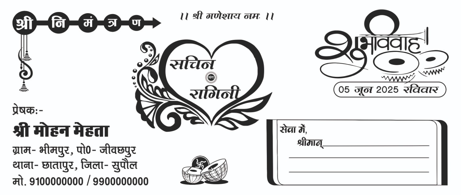 Wedding card Size 250×197, Colour CMYK, designing by Coreldraw software mein kiya gaya hai