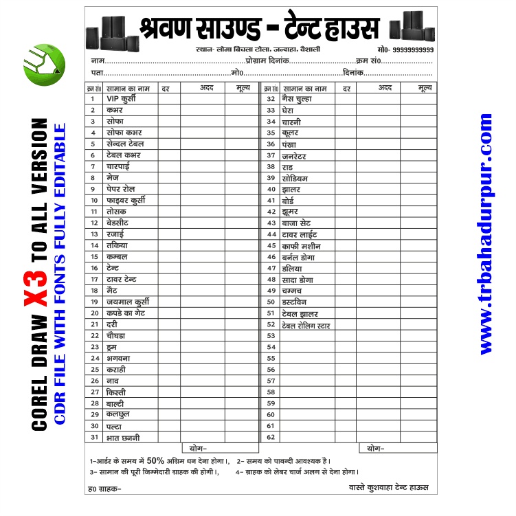 Latest And Best Tent & DJ Bill Book Design CDR File with font