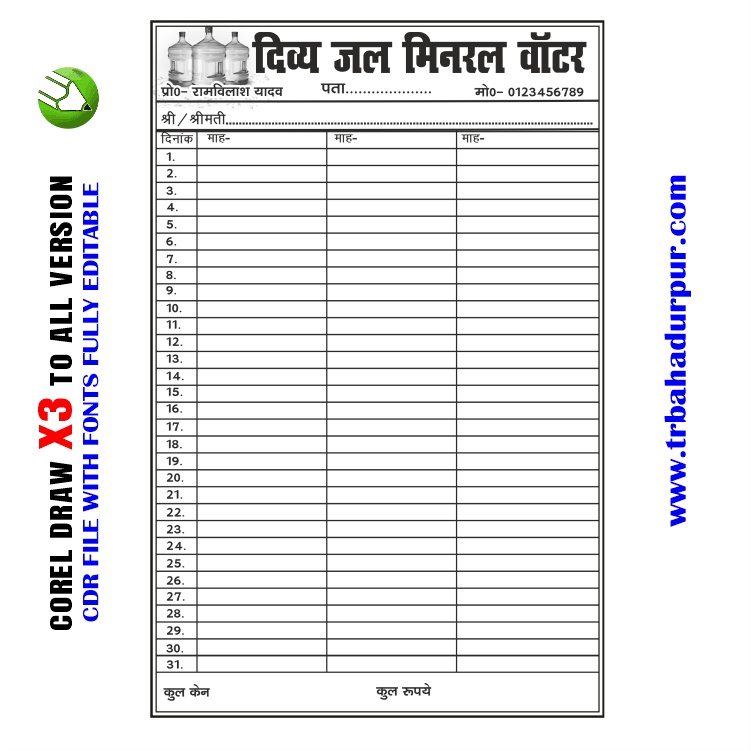 Letest New RO water rasid book Design CDR File with font