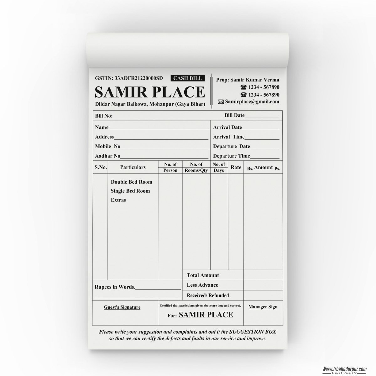 - FILE NAME : SAMIR PLACE/ HOTEL/ LODGE INVOICE BILL BOOK DESIGN